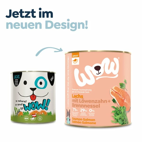 71% Fisch/Muskelfleisch & tierische Nebenerzeugnisse (davon Lachs 20 %), Tomaten 2,5 %, Leinöl, Eierschalenpulver, Seealgen, Brennnesselblätter, Löwenzahnblätter, Mineralstoffe.