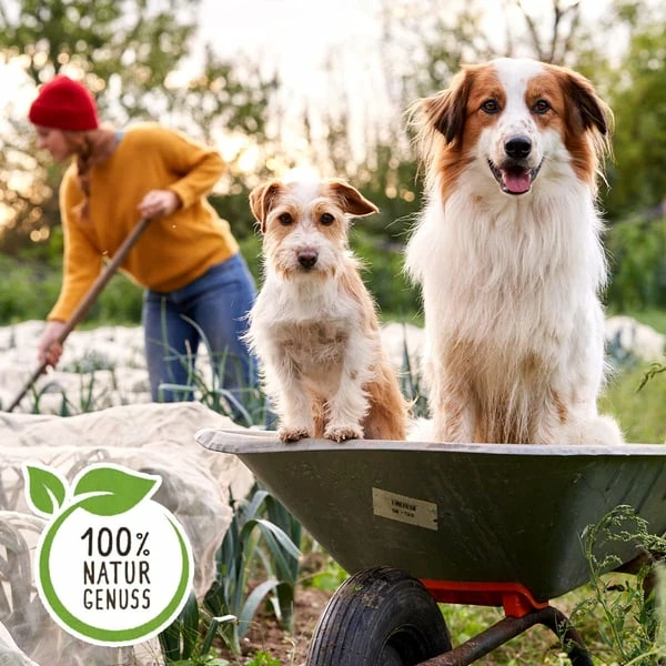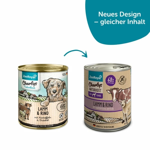34 % vom Lamm (bestehend aus Lammherzen, Lammfleisch, Lammlebern, Lammlungen, Lammpansen), 34 % vom Rind (bestehend aus Rinderherzen, Rindfleisch, Rinderlungen, Rinderlebern, Rinderpansen), Brühe 25,5 %, Kartoffeln 5 %, Mineralstoffe 1 %, Distelöl 0,5 %.