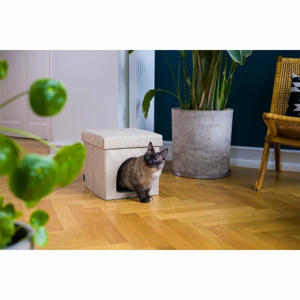 Der pflegeleichte Polyester trocknet schnell und kann außerdem Wärme gut speichern, wodurch der Wohlfühlfaktor auch an nassen und kalten Tagen erhalten bleibt. auf Schadstoffe geprüft, kommt deine Katze mit nichts Unbedenklichem in Kontakt. Zur individuelleren Gestaltung verfügt die Höhle über ein herausnehmbares Kissen, ohne das der Schlafplatz noch etwas geräumiger wird.